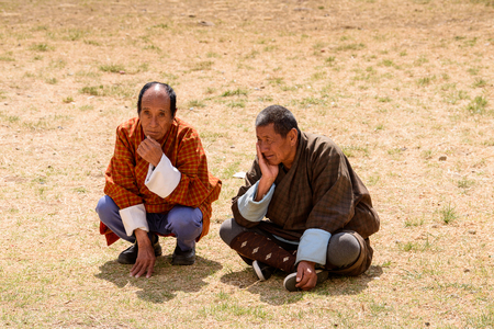 TRIMPHU, BHUTAN - MAR 8, 2017: Unidentified Ngalops two men sit on the ground. Ngalops is one of the most populous ethnic groups of Bhutan