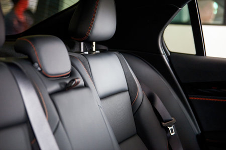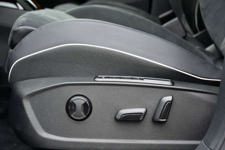 Interior details of a modern car close-up. Stylish beautiful black seats in the car. Car design and interior decoration close-up. Soft focus and beautiful bokeh, little depth of field.