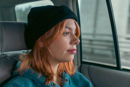 Adorable teenage boy sitting in the rear passenger seat car and looking out the window