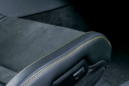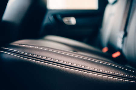 Detail of a stitch of an elegant car seats upholstered in black handmade leather. Side view