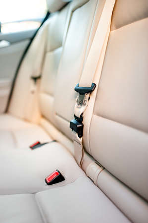 Seat belt on rear seat of modern car with beige leather interior Modern interior of a car with beige leather
