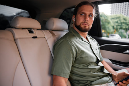 Man seated in a car, wearing earbuds, looking thoughtfully out of the window Natural light illuminates the scene