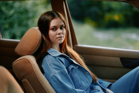 Young woman in denim outfit sitting in a car, conveying calm emotions amidst a natural backdrop, perfect for lifestyle and fashion concepts.