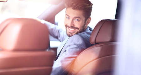 Portrait of an handsome smiling business man driving his car