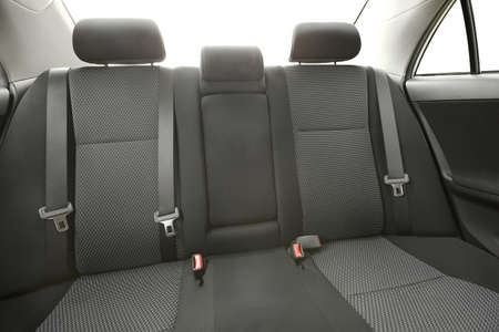 new brown fabric passenger backseat and safty belt in car, selective focus