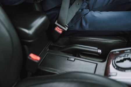 Fastened buckle and a red button of a safety belt, seatbelt in car, traffic regulations concept.