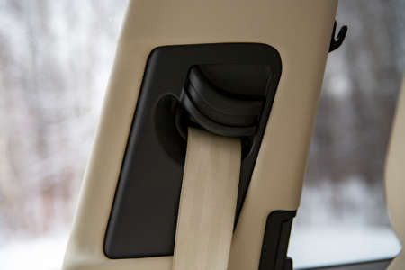 close up side pillar with a light-colored seat belt in a modern car