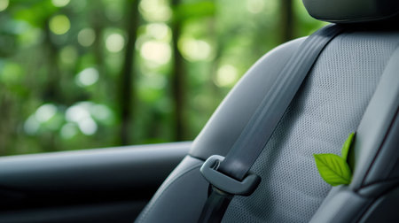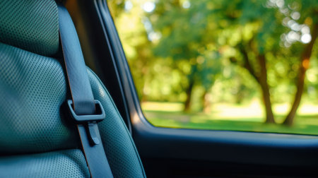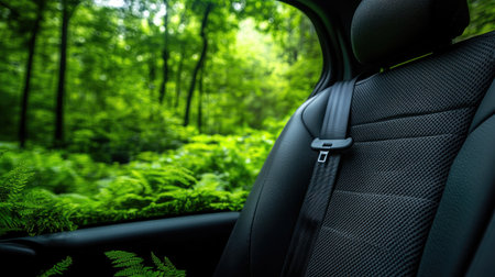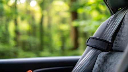 Secure seatbelt on black seat, nature's greenery softly blurred in background