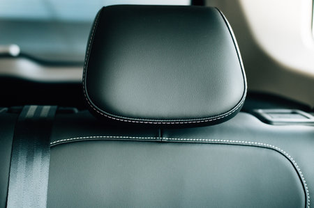 Close-up of rear seat headrest on light blurred background of passenger car interior