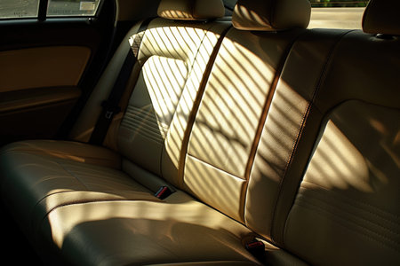 the back seat of a car with sunlight casting shadows, emphasizing the comfort and interior design of the vehicle