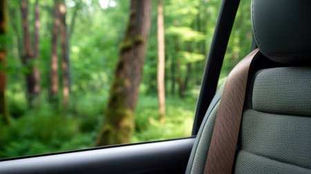 Modern car interior with secure seatbelt, framed by leafy green landscape