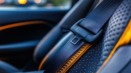 A close-up view showcasing a clicked car seatbelt in a modern vehicle, emphasizing safety and design with textured seat fabric and ambient dashboard light.