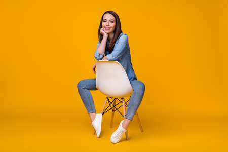 Full length photo of attractive pretty lady good mood overjoyed sitting comfy chair comfortable wear casual denim shirt white shoes isolated bright yellow color background