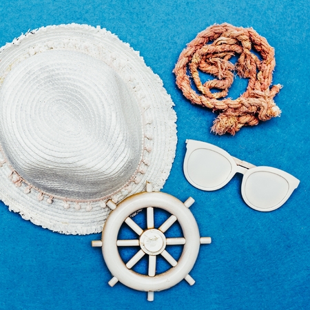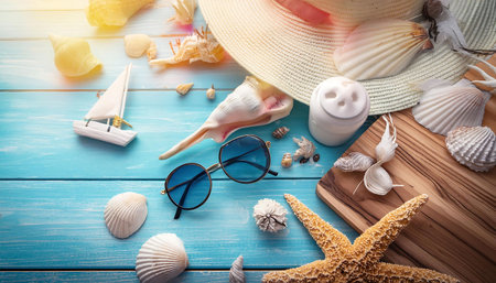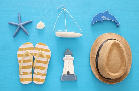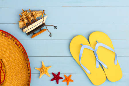 Summer time on a cool view on painted light blue wood table with sunglasses, flip flops, sailboat, hat and starfish