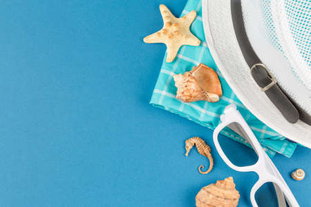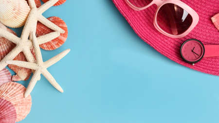 Summer beach background design concept. Top view of holiday travel with shells, hat and sunglasses on blue background.