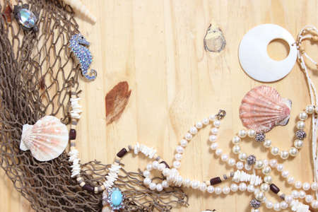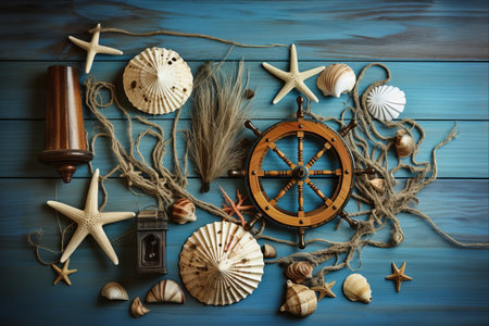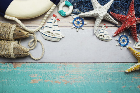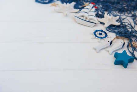 Nautical life style items: sea shells, fish, rope, lifebuoy. Marine concept.