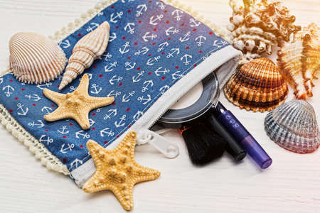 Small anchor printed cosmetic bag with powder, brush and pencils and shells and starfish around