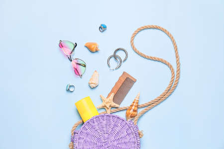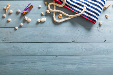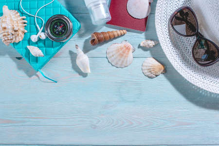 Summer vacation background theme with seashells, bag, hat, sunglasses and blue wood background with copy space. Top view.