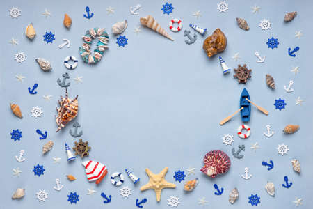 Round frame made of decorative items and miniature toys: seashells, seastars, vessel, boat, anchors, steering wheels, life buoys. Summer background, mock up. Summer vacation and sea travel concept