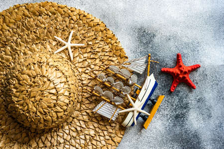 Summer holiday travel background with seashells and toy boat. View from above. Flat lay