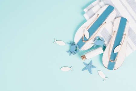 Blue colored summer and holiday background, flip flops, sea stars and a glass bootle with copy space, travel and tourism concept