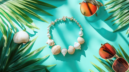 This vibrant summer jewelry display showcases a seashell necklace surrounded by tropical greenery and stylish sunglasses, perfect for beach vibes.