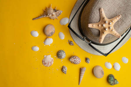 Summer accessories, sea exotic shells, hat and sun glasses on yellow background. Summer vacation and sea concept. Copyspace for text