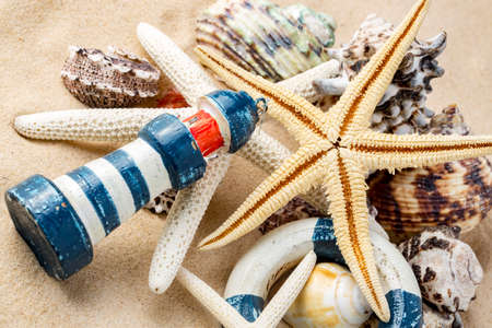 Marine lifestyle: sea shells, starfish, beach chair, life buoy.