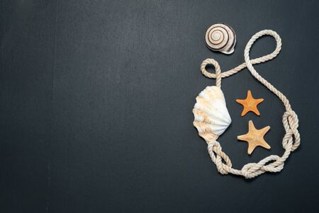 Marine composition of sailor rope and few seashells on a chalkboard.