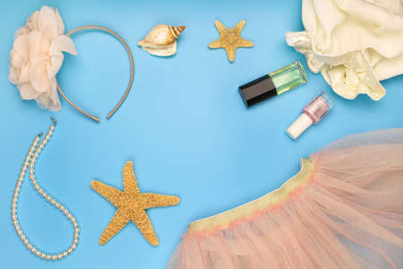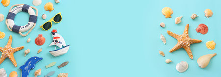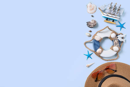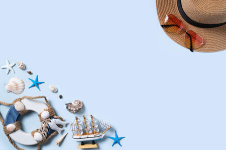 Various decorative nautical items, seashells, sea stars and miniature toys on blue pastel background. Sea travel, summer vacation at ocean concept. Flat lay, top view.