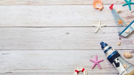 Plank wooden background in mediterranean style with sea shells and lighthouse and vintage compass - horizontal top view