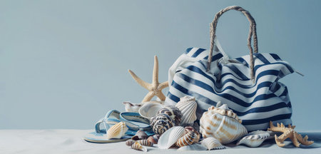 A blue and white striped beach bag filled with seashells, starfish, and sandals. Summer vacation vibes!