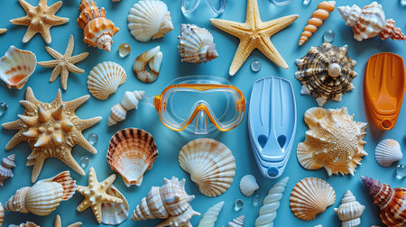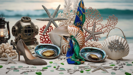 A diverse array of marine objects is arranged on a surface, including shells, starfish, and a vintage diving helmet. The composition features various textures, from the smooth shells to the rough corals. The scene is bathed in natural light, suggesting an outdoor setting with a blurred ocean backdrop. Suitable for editorial and commercial purposes.