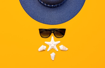 Summer holiday background with hat, sunglasses, seashells and starfish.