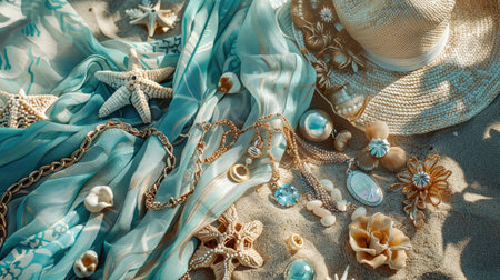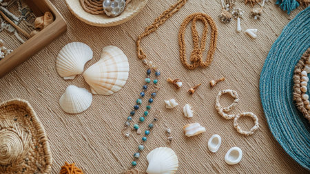 Handcrafted body jewelry made from natural materials, a set of necklace and earrings adorned with intricate patterns, sitting on the sandy beach as a creative art display AIG50
