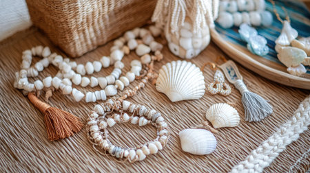 A casual jewelry collage with beach-inspired shell necklaces, braided bracelets, and tassel earrings, laid out on a natural woven mat.