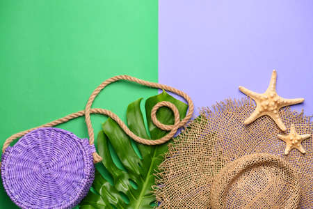 Summer composition with white trendy sunglasses, hat, starfishes and shells on colorful background. Vacation and travel concept.Trendy fashion beach accessories