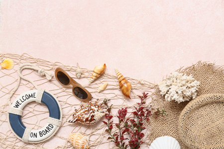 Discover a stunning flat lay design showcasing beach essentials including seashells, coral, a straw hat, and sunglasses on a soothing neutral background. Perfect for summer vibes.