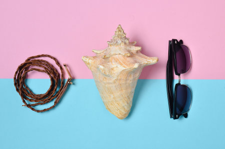 A shell, belt, sunglasses on a pink pastel blue background. Trend of minimalism. The concept of travel and recreation in warm places. Top view. Flat lay.