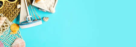 summer beach sea accessories objects,sunglasses,green straw bag,sailing and seashell over blue turquoise banner background
