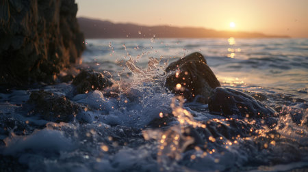 Witnessing the mesmerizing beauty of ocean waves crashing against rocks under a stunning sunset sky