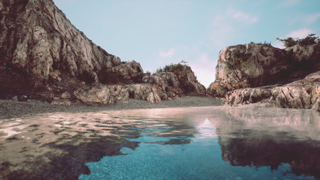In a serene natural setting, calm water mirrors rugged cliffs under a clear sky at twilight. The scene captures the beauty of untouched wilderness, inviting peaceful contemplation and exploration.