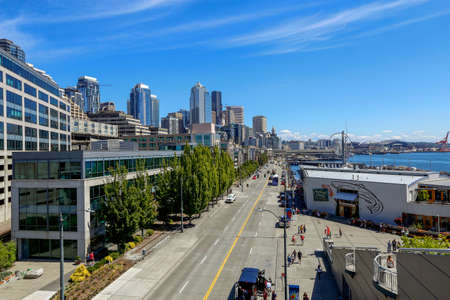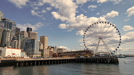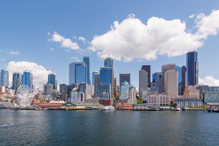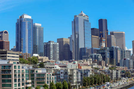 Waterfront Seattle skyline with Great wheel view. Skyscrapers of financial downtown at day time, Washington, USA. A vibrant business neighborhood