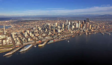 Seattle, USA - September 2, 2018: Aerial view overlooking the city skyline of Seattle Washington with mountain ranges on distant horizon