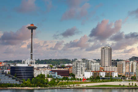 Seattle waterfront downtown buildings skyline view at evening sunset on spring day, Washington, USA