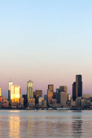 Seattle skyline at sunset with urban skyscrapers and water reflections.