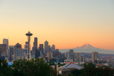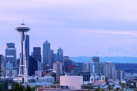 Seattle city skyline with Mt Rainier at sunset with urban office buildings viewed from Kerry Park.