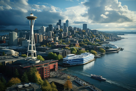 Aerial view of Seattle with Space Needle tower. City downtown. Seattle downtown skyline. Aerial Seattle. Space Needle. Modern Seattle district, Elliott Bay. Architecture of aerial Space needle