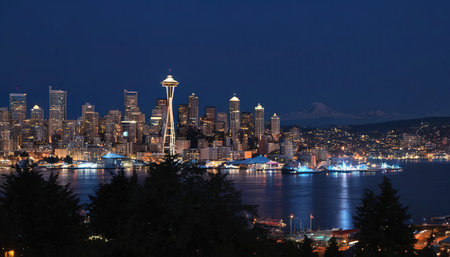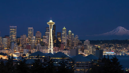Seattle city skyline at night with urban office buildings viewed from Kerry Park.