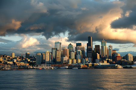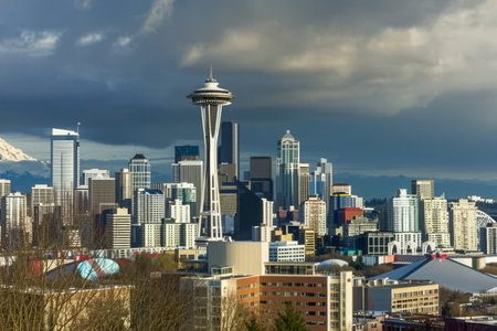 The skyline of Seattle with dramatic clouds AI generated